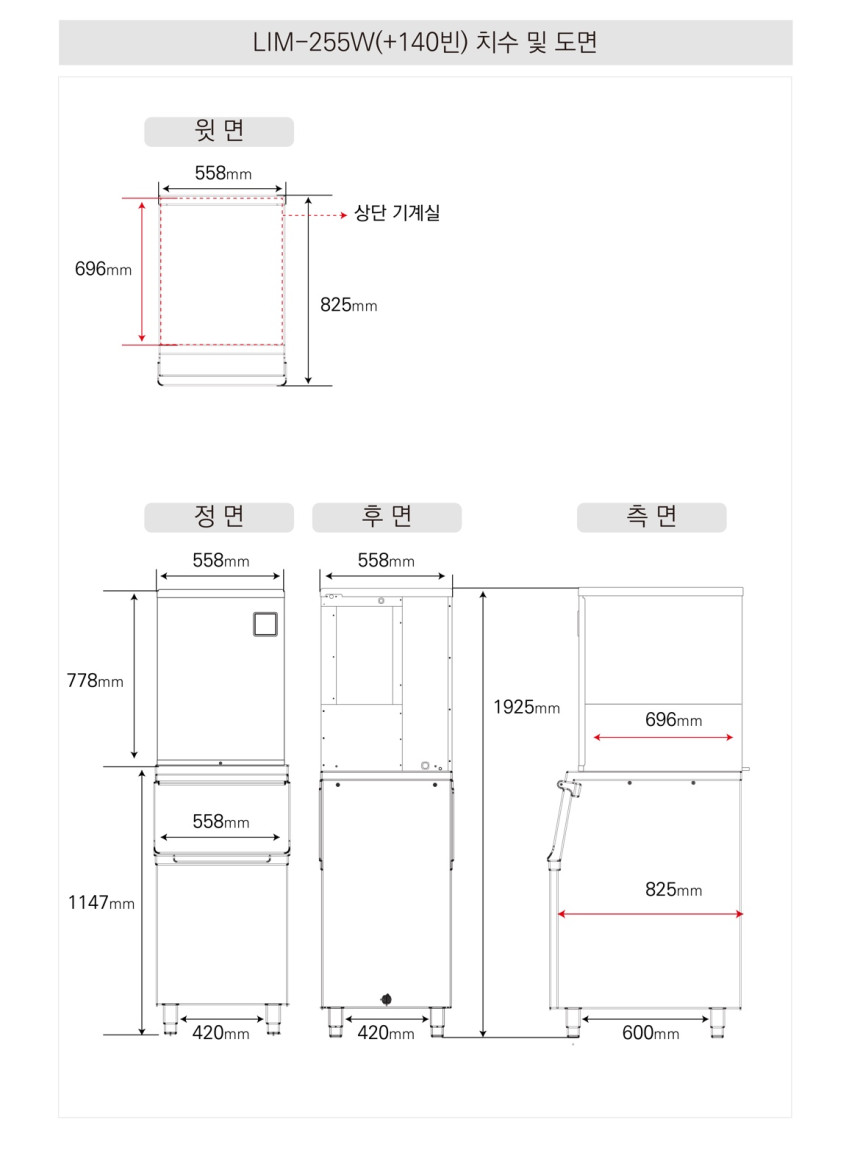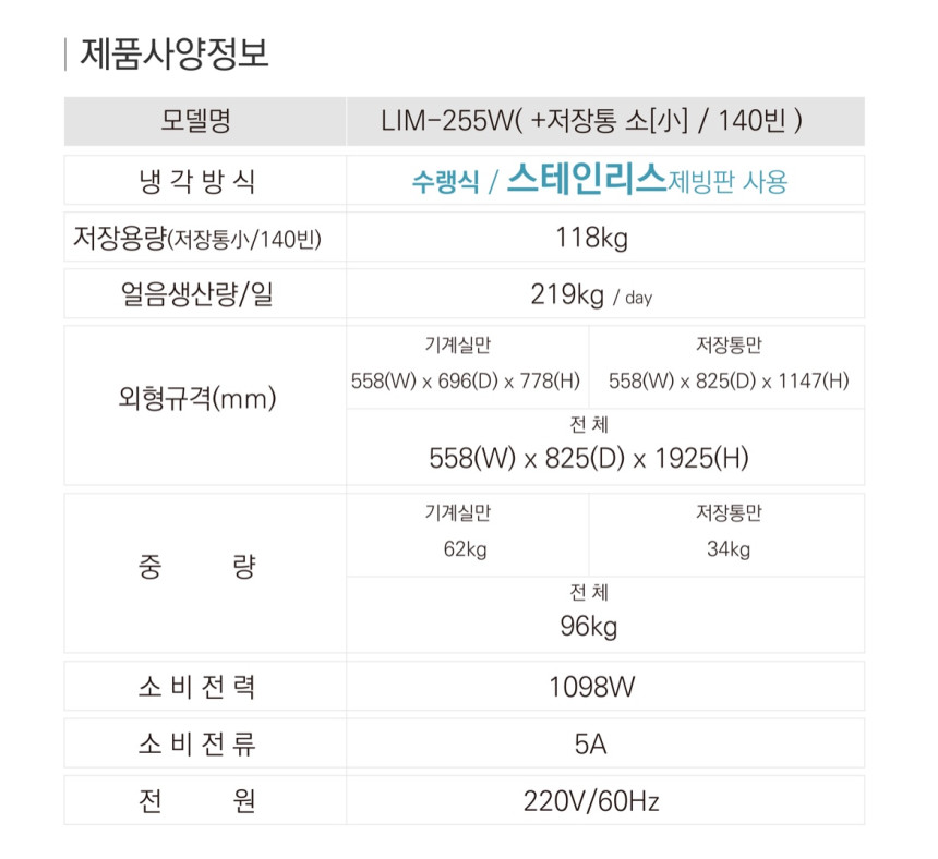 라셀르 [LIM-255W] (+저장통 소[小]) 얼음 생산량 219kg/일 업소용. 영업용. 카페용. 제빙기. 반달얼음. 수랭식. 모듈러형.