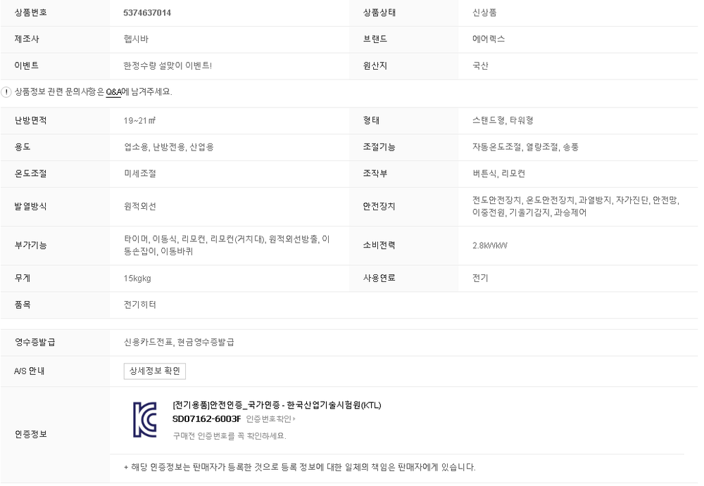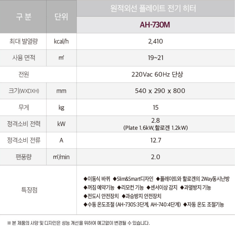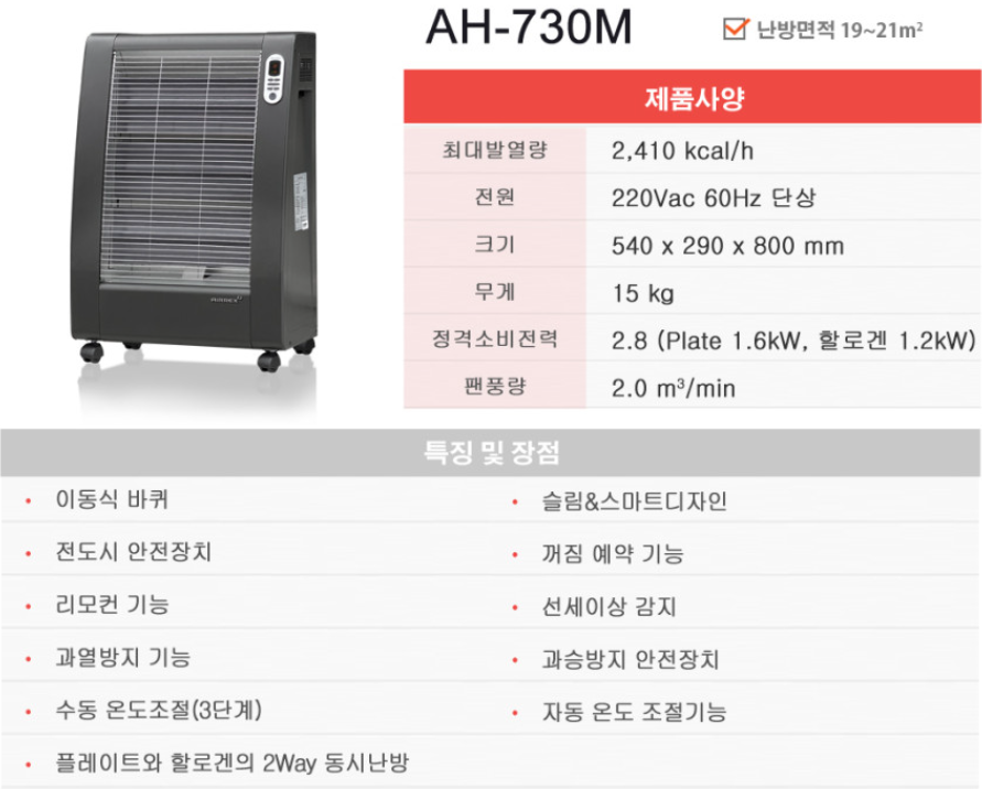 헵시바 에어렉스 AH-730M (6평형) 원적외선 플레이트 전기히터 전기온풍기