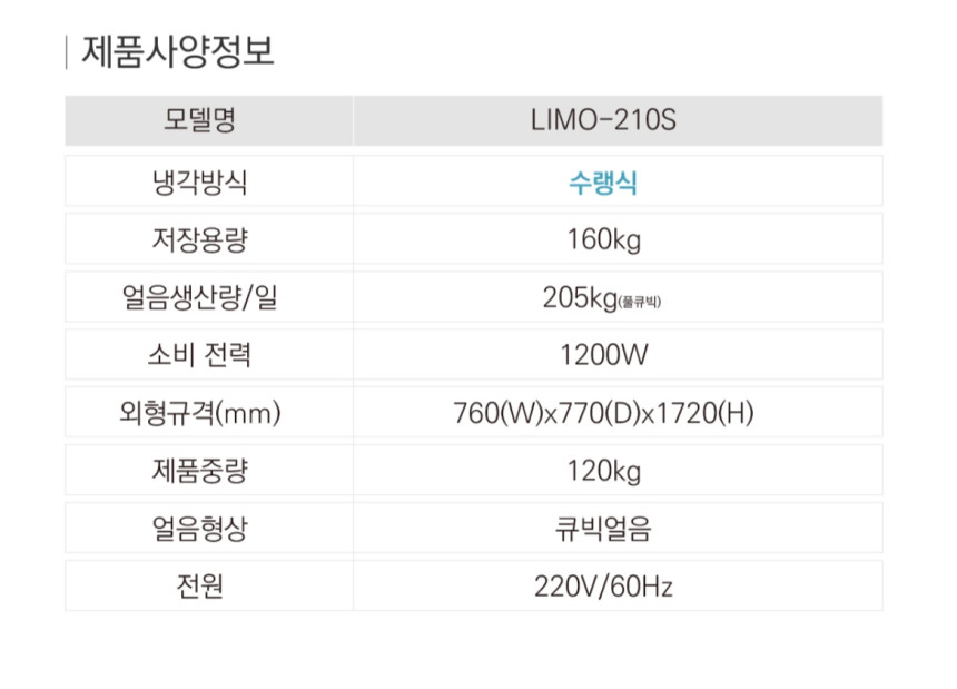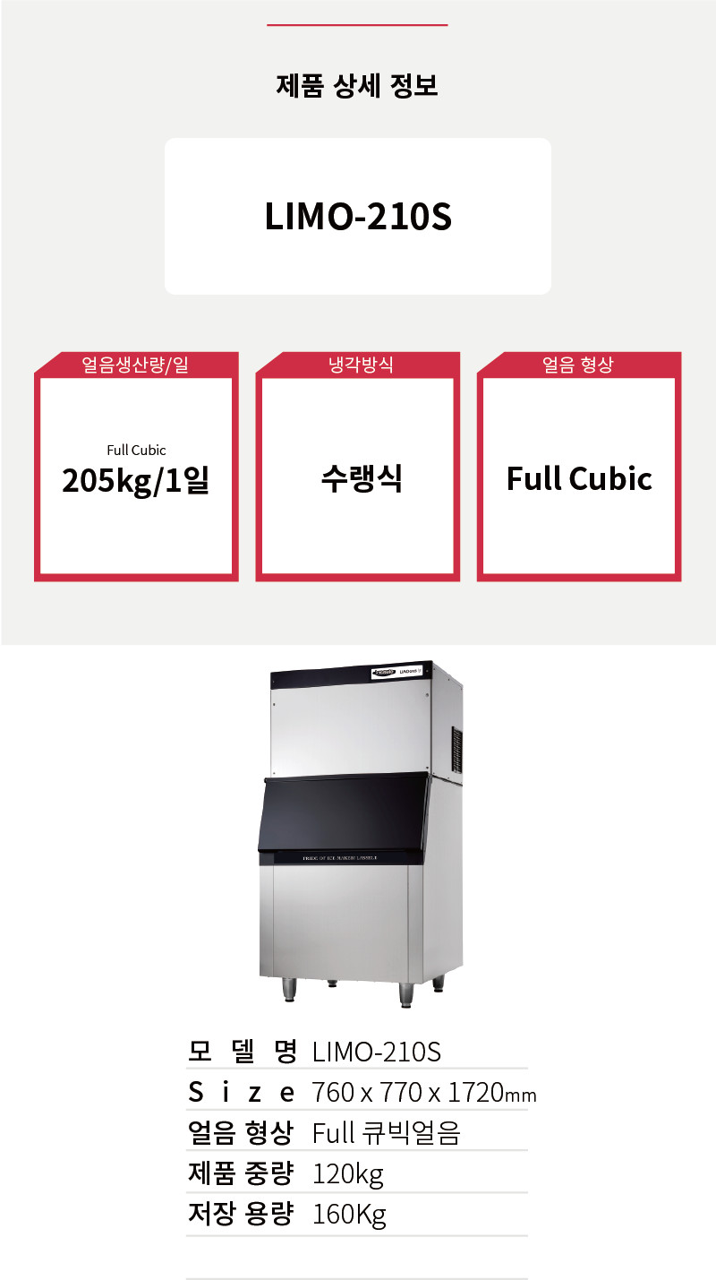 라셀르 [LIMO-210S] 얼음 생산량 205kg/일 업소용. 영업용. 카페용. 제빙기. 큐빅얼음. 수랭식.