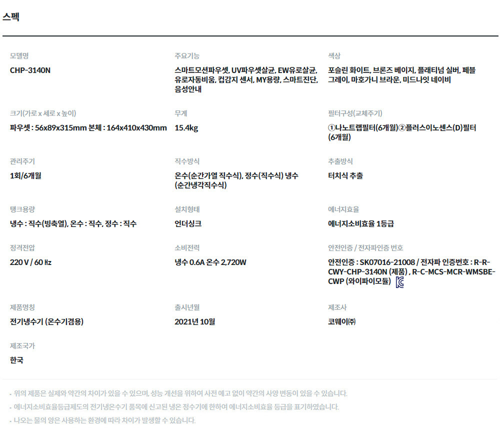 CHP-3140N 코웨이 노블 빌트인 냉온정수기 *월