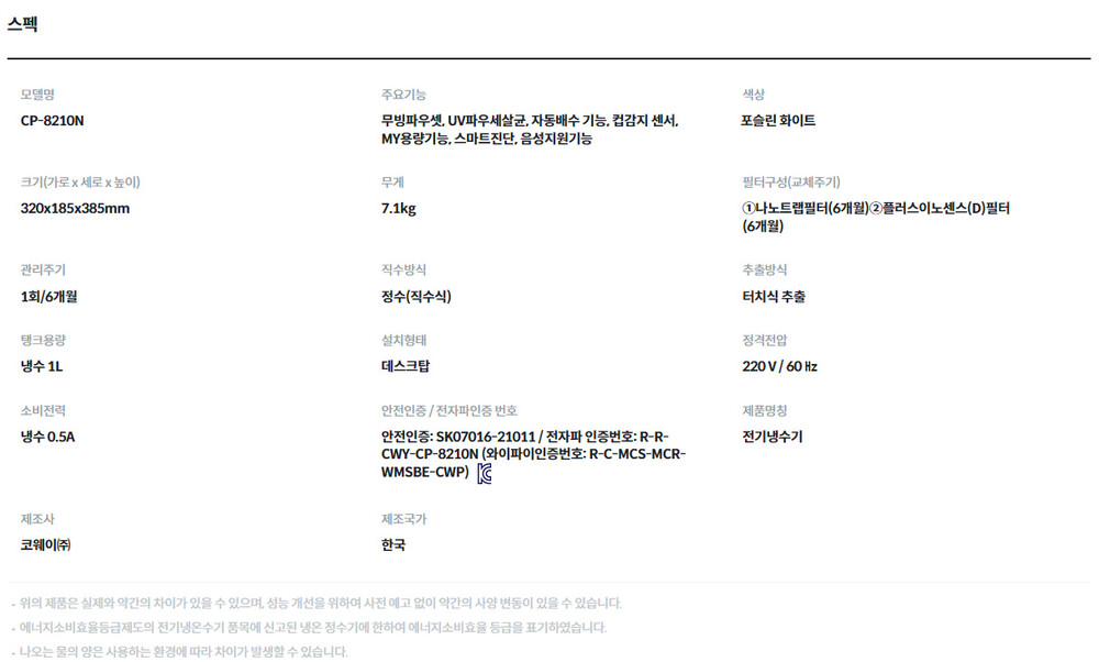 CP-8210N 코웨이 노블 가로 냉정수기 *월