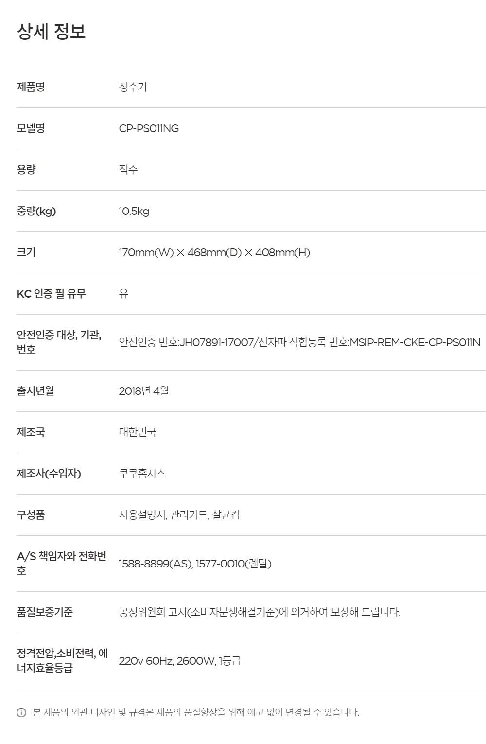 CP-PS011NG/S 쿠쿠 인앤아웃 안심직수 냉온정수기 *월