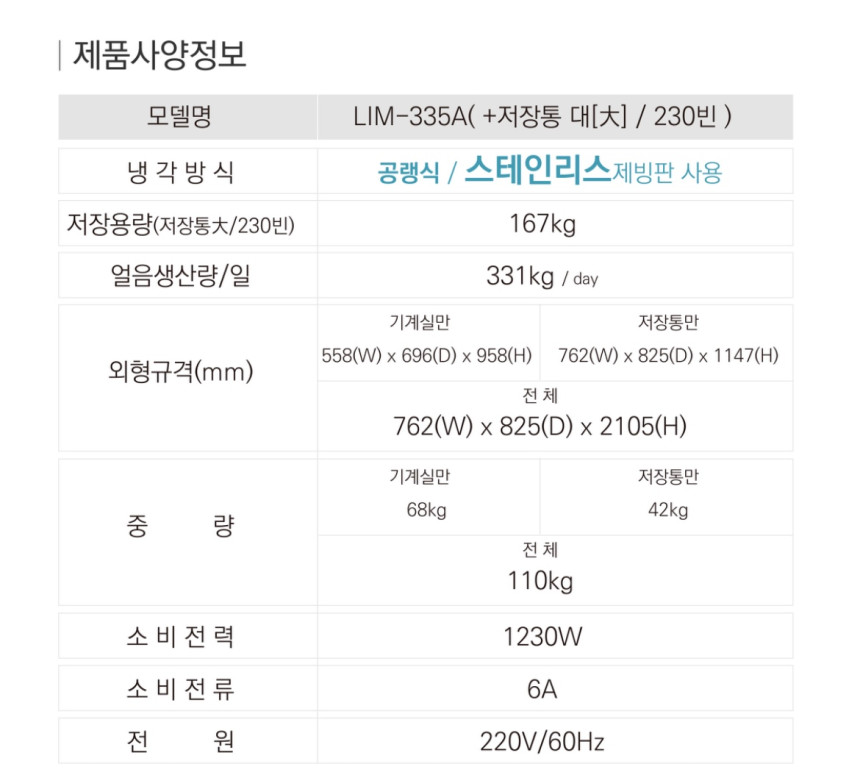라셀르 [LIM-335A] (+저장통 대[大]) 얼음 생산량 331kg/일 업소용. 영업용. 카페용. 제빙기. 반달얼음. 공랭식. 모듈러형.